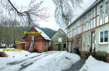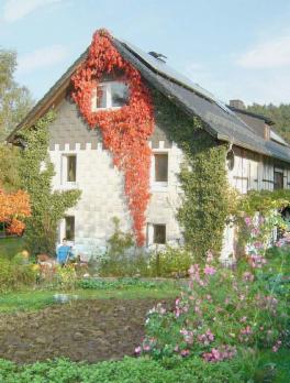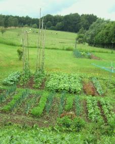 Die Westseite des Hauses ist durch zusätzliche Wärmedämmung geschützt. Die Abendsonne ist hier besonders wohltuend. An dieser Hausseite ist der Blick auf den Gemüse- und Blumengarten frei und der Autoverkehr ist hier kaum hörbar. - Hinter dem Garten beginnt eine große Rinderweide, die sich bis zum Amterother Waldfriedhof hinzieht.